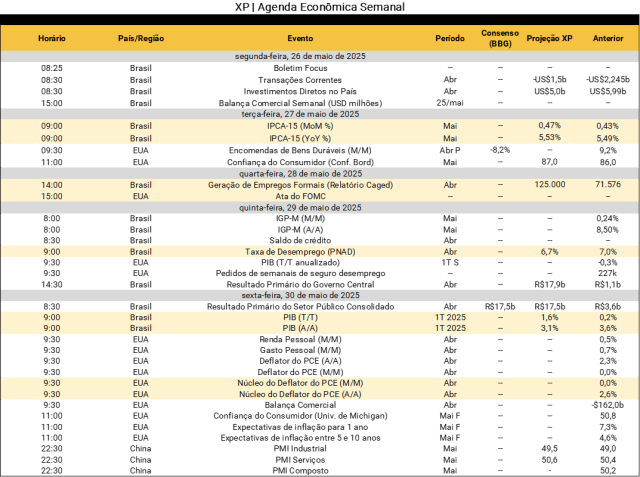 No Brasil, o protagonismo será a divulgação do PIB do 1T25 na 6a-feira, que deverá mostrar forte avanço da agropecuária e demanda doméstica sólida. Ainda do lado da atividade, a geração de empregos formais (relatório Caged) e a PNAD contínua serão publicadas. Por fim, conheceremos o IPCA-15 de maio, cujas métricas subjacentes continuarão sob pressão.