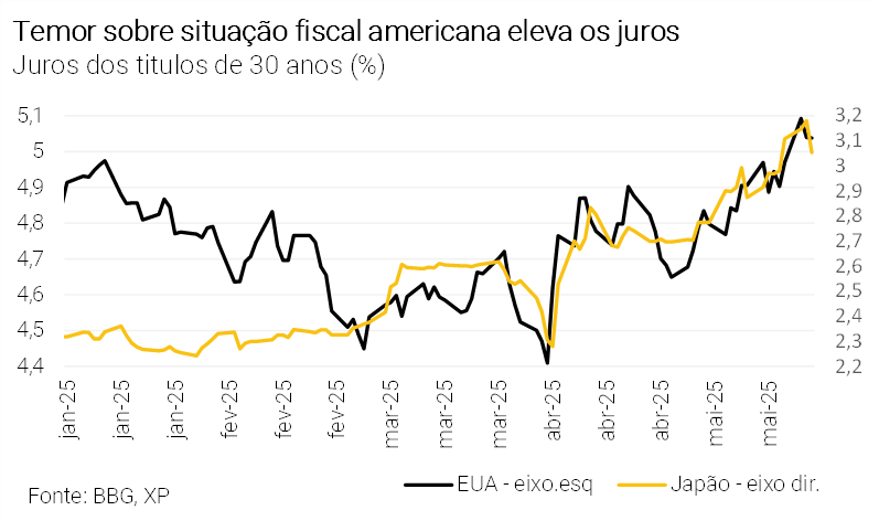 Os juros dos títulos do Tesouro do EUA estão em alta, impulsionados pelas medidas expansionistas fiscais do presidente Trump, que podem adicionar US$ 3,8 trilhões na dívida americana nos próximos anos. A Câmara dos Representantes votará a extensão dos cortes de impostos de 2017 e um corte adicional nos impostos cobrados sobre algumas despesas de consumo e financiamentos de veículos, além de aumentar os gastos com defesa e segurança nas fronteiras. Os juros dos títulos do Tesouro americano de 10 anos – referência para precificação de ativos globais – chegaram a ser negociados acima de 4,6%, enquanto os títulos de 30 anos chegaram a ultrapassar 5,1%.