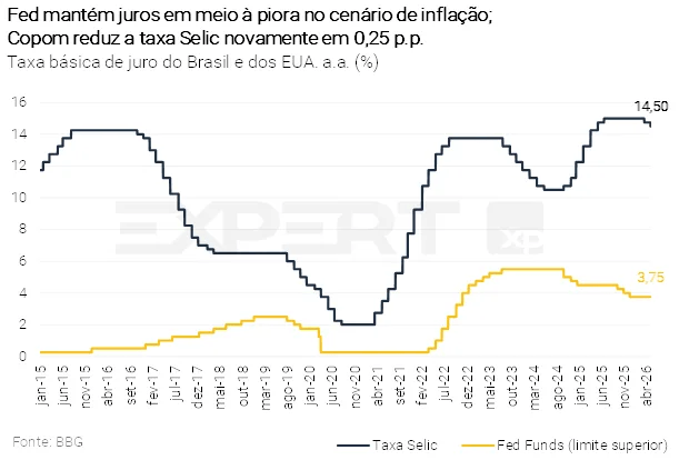 O Comitê de Política Monetária (Copom) do Banco Central reduziu a taxa Selic em 0,25 p.p., para 14,50% ao ano, em linha com as expectativas. O comunicado pós-decisão reconheceu a deterioração do cenário inflacionário — com projeções “distanciando-se adicionalmente da meta” —, incluindo no balanço de riscos a possibilidade de efeitos de segunda ordem da restrição de oferta de petróleo sobre as expectativas de médio prazo. Ainda assim, o Copom sinalizou que a política monetária restritiva em curso tem sido eficaz em conter a atividade econômica, criando espaço para que o ritmo e a extensão do ciclo de cortes — de 0,25 p.p. ou 0,50 p.p. por reunião — sejam calibrados a depender do fluxo de novas informações.