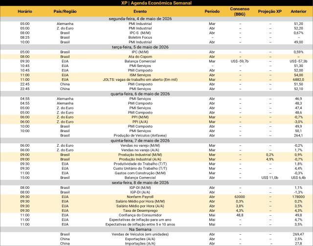 No Brasil, o Comitê de Política Monetária (Copom) publicará a ata da última reunião, que reduziu a taxa Selic para 14,50%. Além disso, conheceremos a produção industrial de março e a balança comercial de abril. Veja as nossas projeções abaixo.