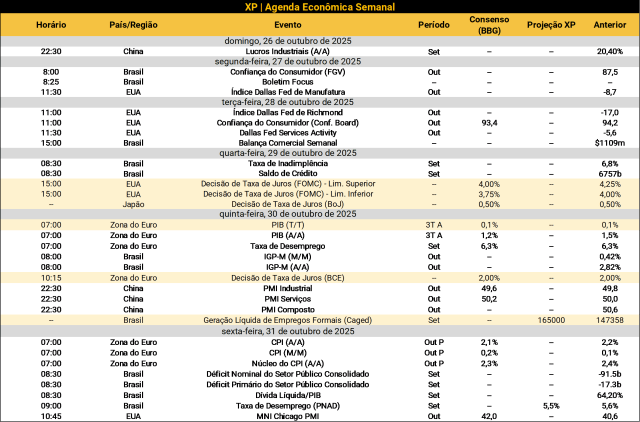 No cenário internacional, destaque à decisão de política monetária do Fed, banco central dos Estados Unidos. O mercado espera mais um corte de 0,25 p.p. na taxa de juros básica após retomada do ciclo de cortes na reunião anterior. O país segue em shutdown, mantendo suspensa a publicação de dados econômicos oficiais. Decisões de política monetária também ocorrerão na zona do euro e no Japão. Por fim, na zona do euro conheceremos o PIB do 3º trimestre e a inflação ao consumidor.