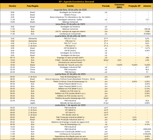 No Brasil, as negociações entre Brasil e Estados Unidos serão destaque. Ademais, teremos decisão da taxa Selic pelo Comitê de Política Monetária (Copom) do Banco Central na 4ª-feira. Acreditamos que o Copom manterá a taxa básica de juros em 15,00%, em linha com o endereçado nas últimas comunicações oficiais. Também conheceremos a taxa de desemprego e a produção industrial de junho.