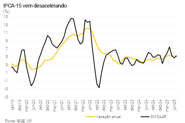 Em suma, o IPCA-15 de julho trouxe (novamente) alívio disseminado nos preços livres. A leitura é consistente com nosso cenário de IPCA a 5,0% em 2025 (ou até menos). Para 2026, mantemos nossa projeção em 4,5%.