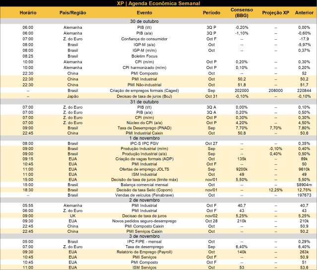Na agenda internacional, os índices PMI de outubro serão divulgados ao longo da semana na China, Estados Unidos, zona do euro e Reino Unido. O índice PMI reflete uma sondagem com empresários sobre as condições econômicas e de negócios nos países. Na 3ª-feira, destaque para ao índice de inflação ao consumidor de outubro e o resultado do PIB do terceiro trimestre na zona do euro. Na 4ª-feira, haverá a publicação do relatório JOLTS de setembro, que traz a abertura de vagas e a oferta de mão de obra no mercado de trabalho dos EUA. No mesmo dia, teremos o principal evento da semana – a decisão de política monetária do Federal Reserve (Fed, o banco central dos EUA). A expectativa é de manutenção da taxa de juros de referência em 5,5%. Na 5ª-feira, será a vez do Banco da Inglaterra (BoE) anunciar sua decisão de política monetária para o Reino Unido. Por último, na 6ª-feira, o protagonismo fica com o Nonfarm Payroll de outubro, o principal relatório de emprego da economia americana.