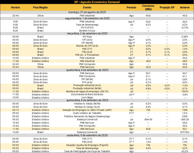A agenda internacional da próxima semana está repleta de indicadores. Nos Estados Unidos, atenções voltadas para a publicação de estatísticas sobre o mercado de trabalho em agosto, em particular o Nonfarm Payroll. Dados recentes sobre geração de empregos vieram abaixo das expectativas, aumentando as chances de corte de juros pelo Federal Reserve na próxima decisão de política monetária. Sondagens industriais e de serviços (ISM e PMI) de agosto também serão acompanhadas de perto pelos analistas. Na Zona do Euro, os resultados do PIB do 2º trimestre, a taxa de desemprego de julho e a inflação ao consumidor de agosto devem ter protagonismo.