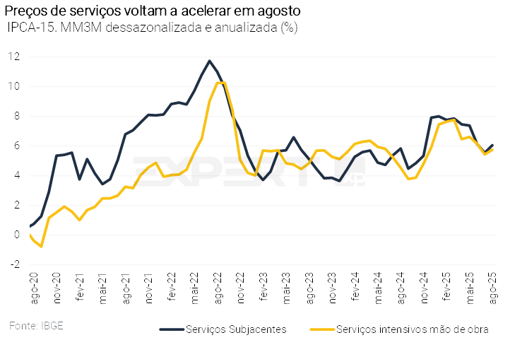 Em julho, foram criados 129,8 mil empregos formais, em linha com a nossa projeção. O mercado de trabalho segue como pilar da demanda doméstica. Os baixos níveis da taxa de desemprego e o avanço contínuo dos salários reais devem persistir nos próximos trimestres e seguir pressionando a inflação de serviços, que voltou a acelerar no IPCA-15 de agosto.  O indicador contraiu 0,14% em relação ao mês anterior, acima das expectativas, com a inflação anual caindo de 5,30% para 4,85%. Por um lado, os preços dos bens comercializáveis cederam pela valorização da moeda e o pagamento do bônus de Itaipu derrubou as contas de energia. Por outro), a inflação de serviços acelerou para 0,55% em relação ao mês anterior, refletindo um mercado de trabalho apertado e um sólido crescimento dos salários.