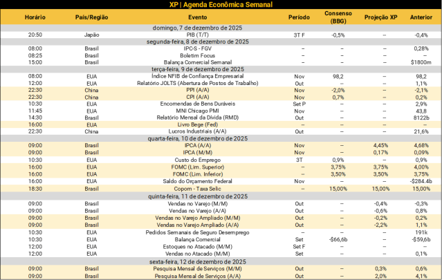 No Brasil, também haverá decisão de política monetária. O Copom deve manter a taxa Selic em 15,00%, com o mercado procurando eventuais sinais sobre os próximos passos. As apostas para início do ciclo de corte de juros em janeiro estão ao redor de 65%. Além disso, o IBGE divulgará o IPCA de novembro, leitura marcada pela ação promocional de Black Friday e uma deflação atípica no grupo de alimentos. Por fim, do lado da atividade econômica, destaque para as pesquisas mensais do comércio varejista (PMC) e de serviços (PMS) referentes a outubro. Veja as nossas projeções abaixo.