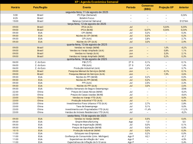 No cenário internacional, o destaque será a divulgação dos dados de inflação ao consumidor e produtor nos Estados Unidos, ambos referentes a julho. Ainda, será relevante observar a dinâmica do varejo e da indústria no último mês. Na China, o combo de dados de atividade de julho será publicado pelo governo, com destaque para produção industrial, vendas no varejo, taxa de desemprego e investimentos em ativos fixos.