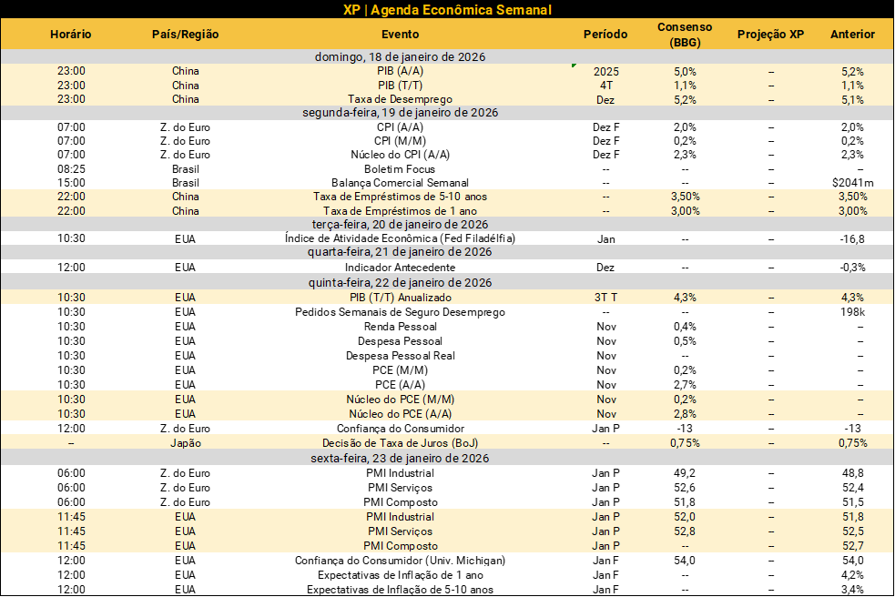No cenário internacional, o destaque será a divulgação do índice de preços PCE (deflator das despesas de consumo) nos Estados Unidos, referente a novembro – trata-se do indicador de inflação mais relevante para o Fed, que teve divulgação atrasada pelo shutdown. Na China, serão publicadas as estatísticas de atividade econômica do 4T25, com destaque para o PIB e a taxa de desemprego. Além disso, o banco central chinês (PBoC) definirá as taxas de empréstimos de curto e longo prazo. No Japão, o banco central (BoJ) também decidirá sobre a taxa básica de juros, atualmente em 0,75%. Por fim, índices PMI serão divulgados nas principais economias – lembrando que PMIs são sondagens empresariais que visam captar o pulso da atividade econômica.