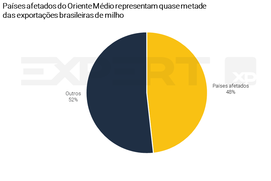 Com relação aos grãos, o Irã foi o principal destino das exportações brasileiras de milho em 2025, e os países diretamente afetados pelo conflito responderam por 48% das exportações de milho.