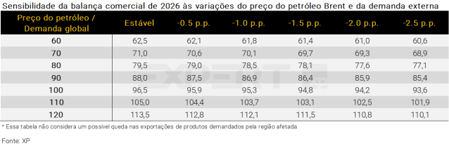 Mantidas as demais condições constantes, estimamos que cada aumento de US$ 10 no Brent melhora a balança comercial em cerca de US$ 8,5 bilhões. Contudo, existem algumas ressalvas importantes.
