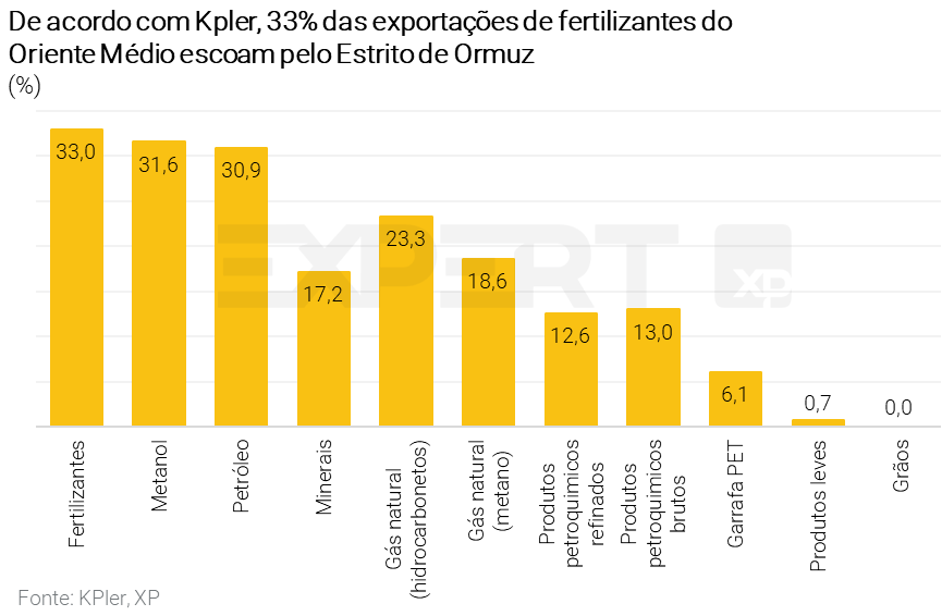 Ainda assim, essas estimativas não capturam totalmente possíveis disrupções logísticas decorrentes do conflito no Oriente Médio. A exposição do Brasil à região está concentrada em: milho, frango, açúcar, fertilizantes e carne bovina.