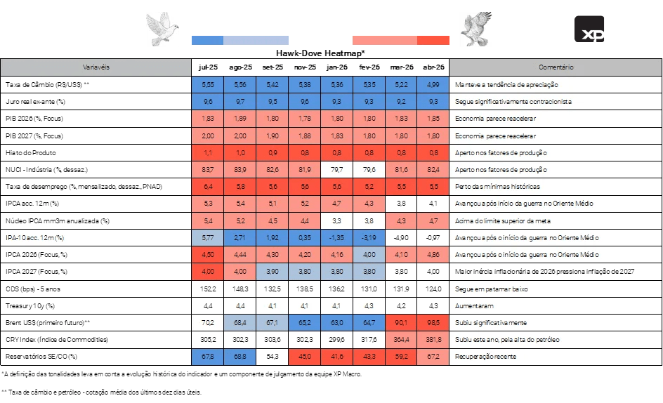 Balanço de riscos assimétrico para cima. Nesse contexto, avaliamos que o Copom deverá alterar o balanço de riscos em torno das projeções de inflação. O comunicado da reunião de março indicou que “os riscos para os cenários de inflação, tanto para cima quanto para baixo, que já se encontravam acima do usual, se intensificaram após o início dos conflitos no Oriente Médio”. Desta vez, esperamos que o Comitê explicite que o balanço de riscos para a projeção do IPCA de 2027 — que deve subir marginalmente de 3,3% para 3,4% — está assimétrico para cima.