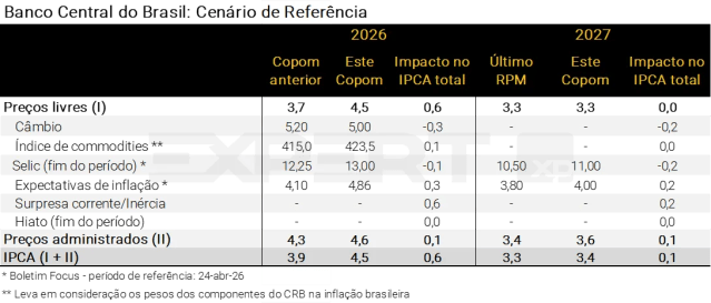 Na última reunião do Copom, realizada em março, a projeção de inflação no cenário de referência ficou em 3,9% para o final de 2026. Em relação ao final de 2027, o atual horizonte relevante de política monetária, o último Relatório de Política Monetária (RPM) apresentou projeção de 3,3%.