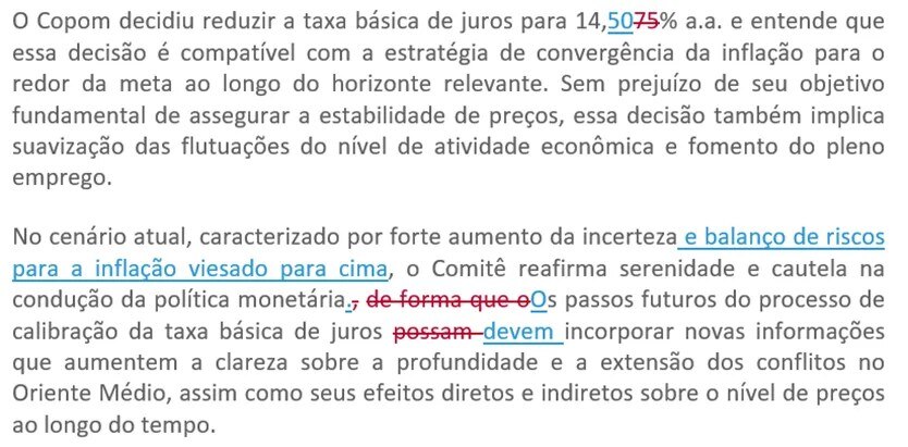 - O comunicado desta semana tende a ser mais duro (hawkish) do que o anterior, reforçando a necessidade de uma condução cautelosa da política monetária para mitigar efeitos de médio prazo decorrentes dos choques inflacionários. Mas não a ponto de sinalizar uma possível interrupção do ciclo de calibração no curto prazo;