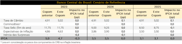 - Acreditamos que o BC divulgará uma projeção de IPCA mais baixa para 2023 (de 5,0% para 4,7%) e estabilidade para 2024 (3,5%) e 2025 (3,1%);