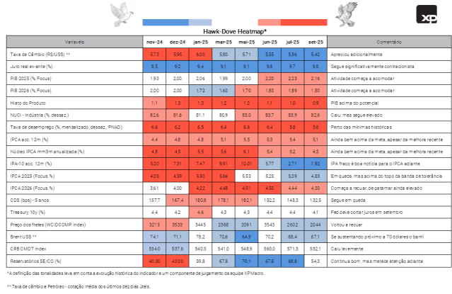- Pela segunda reunião consecutiva do Copom, o fluxo de dados e notícias se mostrou majoritariamente benigno para as perspectivas de inflação. O Fed (banco central dos EUA) provavelmente retomará seu ciclo de corte de juros; a taxa de câmbio se fortaleceu um pouco mais; a atividade doméstica mostrou sinais adicionais de desaceleração; e as expectativas inflacionárias recuaram marginalmente, embora continuem acima da meta de 3,0%;
