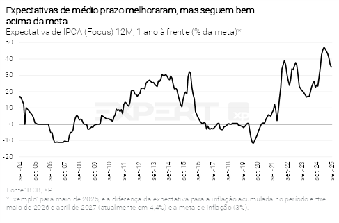 O balanço de riscos para a inflação melhorou recentemente, mas ainda parece cedo para discutir cortes de juros. As expectativas inflacionárias permanecem significativamente acima da meta. Membros do BCB continuam a enfatizar, em seus discursos públicos, que a taxa Selic deve seguir inalterada por um “período bastante prolongado”.