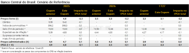 Na última reunião do Copom, realizada no final de julho, as projeções de inflação no cenário de referência ficaram em 4,9% para o final de 2025, 3,6% para o final de 2026 e 3,4% para o 1º trimestre de 2027, o atual horizonte relevante de política monetária.