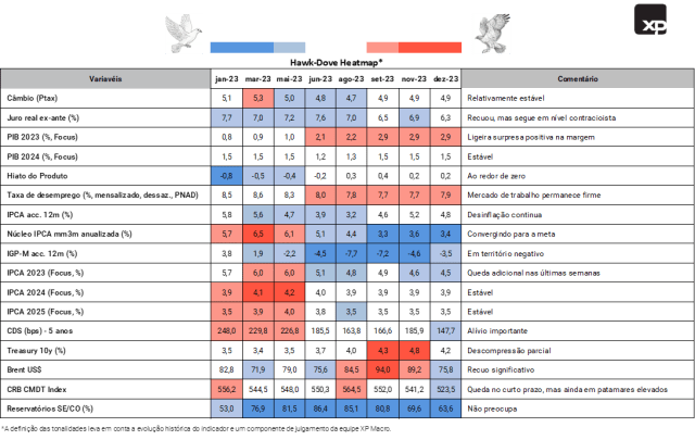 Hawk-Dove Heatmap: desinflação de curto prazo continua, ambiente externo melhorou. Mas o risco fiscal persiste (aumentou um pouco, na verdade).
