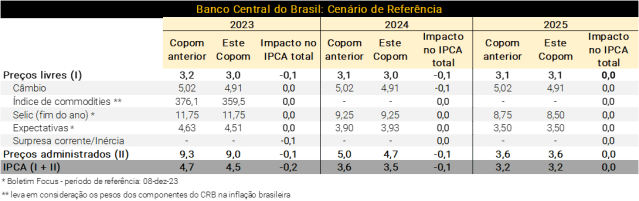 Na última reunião do Copom, as projeções de inflação no cenário de referência do BC eram de 4,7% para 2023, 3,6% para 2024 e 3,2% para 2025.