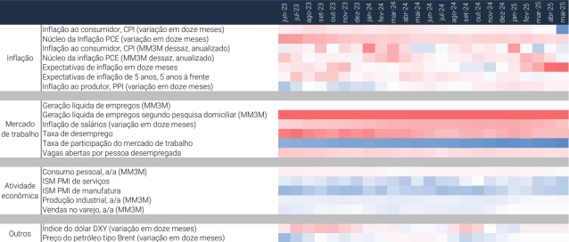 O mapa de calor abaixo mostra os principais indicadores que afetam a decisão de juros nos EUA: inflação, mercado de trabalho, atividade econômica e também outros números, como o nível do dólar e preços de combustíveis (que influenciam a inflação).