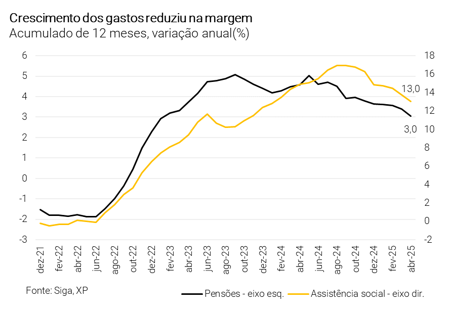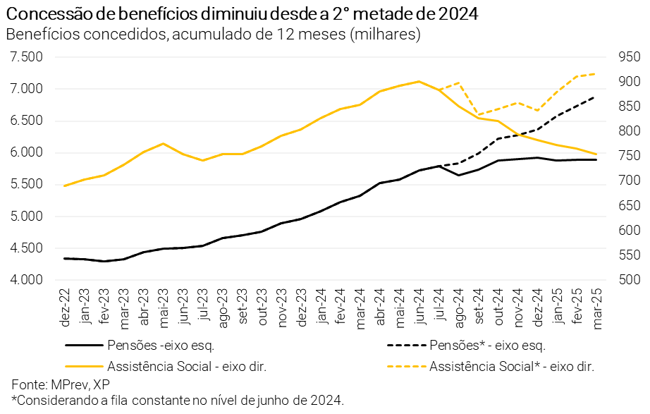 Concessões de benefícios se estabilizaram nos últimos meses… Segundo dados publicados pelo Ministério da Previdência Social, as concessões acumuladas em 12 meses praticamente se estabilizaram em torno de 5,8 milhões desde o segundo semestre do ano passado. A assistência social (BPC/LOAS), por sua vez, apresentou uma queda significativa, passando de 900 mil em junho de 2024 para menos de 750 mil em março deste ano.