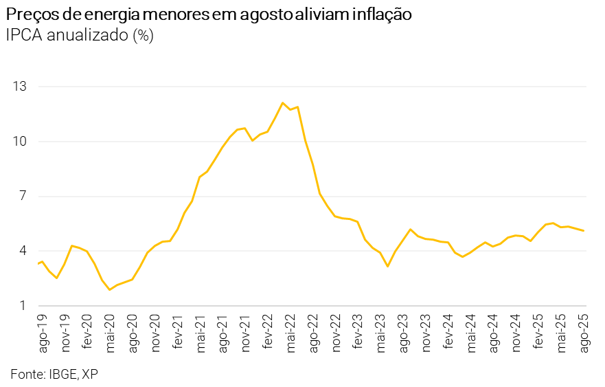 O resultado de agosto reforça que a desinflação recente está ligada à queda nos preços de bens e alimentos, favorecida pela valorização do real e boas condições climáticas. No entanto, os serviços permanecem em níveis altos, sustentados por um mercado de trabalho aquecido e expectativas elevadas. A XP mantém sua projeção de IPCA em 4,8% no fim de 2025 e espera que o Copom inicie o ciclo de cortes de juros apenas em janeiro.