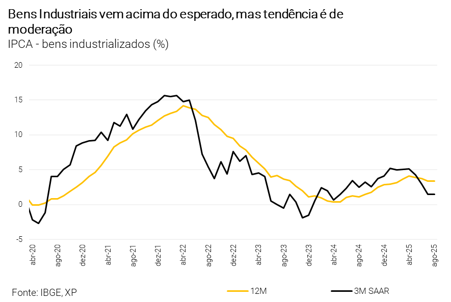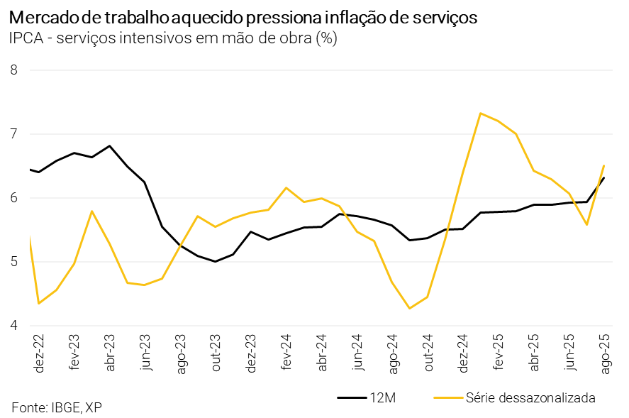 Os preços de serviços, que refletem mais a dinâmica interna da economia, avançaram 0,34% em agosto, um pouco abaixo da projeção (0,38%). A média anualizada em três meses (3M SAAR) recuou levemente, de 6,1% para 6,0%, mas segue em patamar elevado, o dobro da meta. Serviços intensivos em mão de obra subiram 0,65%, acelerando a média anualizada desse grupo de 5,6% para 6,5%. Mesmo com descontos pontuais, como a “Semana do Cinema”, a inflação de serviços continua pressionada e deve voltar a acelerar em setembro.