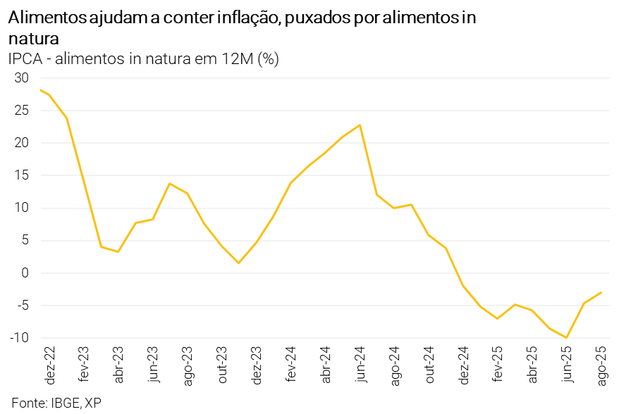 O destaque do mês foi a queda nos preços monitorados, com energia elétrica recuando 4,2%, o que contribuiu para a deflação geral. Já os alimentos também ajudaram, com redução de 0,83%, puxada por hortifrutis, cereais e proteínas. Essa dinâmica deve continuar no curto prazo, mas tende a reverter no fim do ano por conta da sazonalidade.