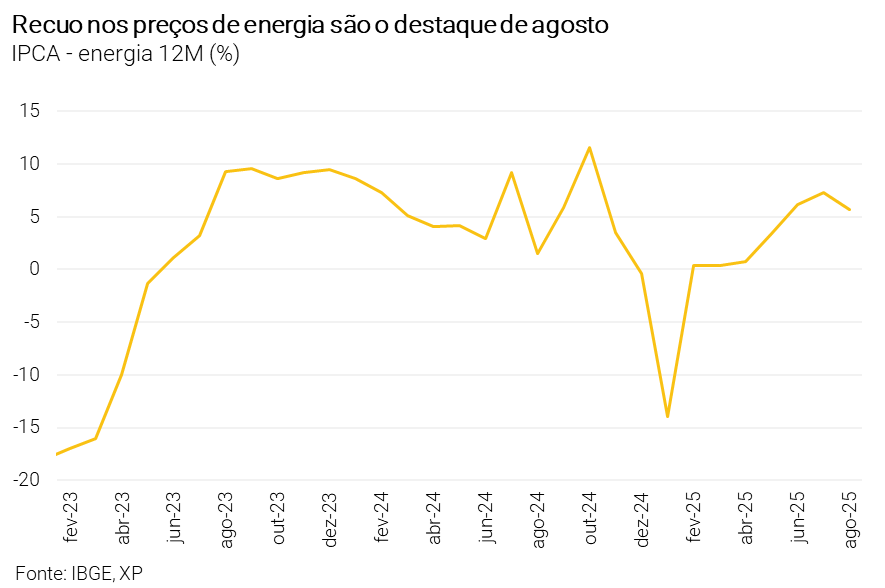 O IPCA registrou queda de 0,11% em agosto, segundo o IBGE, um recuo menor do que o esperado pelo mercado e pela XP (-0,15%). Com isso, a inflação acumulada em 12 meses passou de 5,23% em julho para 5,13% em agosto. A deflação no mês foi explicada principalmente pela redução nas tarifas de energia elétrica, que caíram 4,2% após o pagamento do bônus de Itaipu, ofuscando a ativação da bandeira vermelha patamar 2. Por outro lado, alguns itens surpreenderam para cima, como automóveis novos e vestuário.