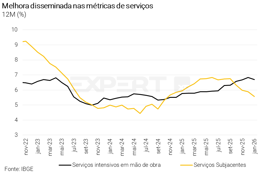 Entre os serviços mais sensíveis ao mercado de trabalho, os intensivos em mão de obra subiram 0,63% na comparação mensal, um pouco abaixo do esperado (0,67%). O 3M SAAR desse grupo desacelerou de 7,8% para 7,2%, retornando aos níveis de outubro, em linha com a leitura de moderação gradual para 2026. No balanço, seguimos projetando que a inflação de serviços recue de 6,0% em 2025 para 5,3% em 2026, à medida que a inércia arrefece e as expectativas permanecem mais bem ancoradas.