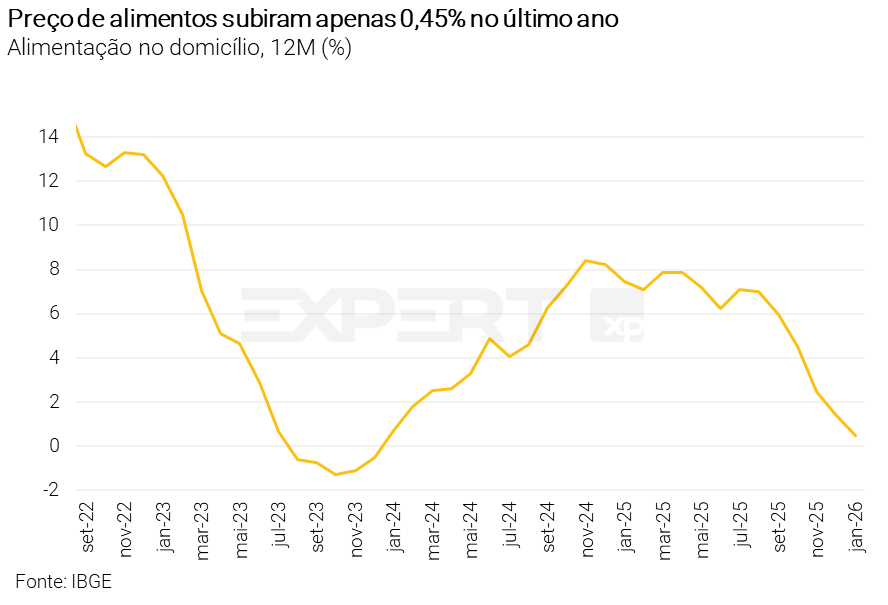 Os alimentos avançaram 0,10% na comparação mensal, abaixo da expectativa (0,29%), configurando a menor leitura para um mês de janeiro desde 2006. O alívio veio, em especial, de tubérculos, raízes e legumes, com destaque para batata, e também de quedas em frutas.