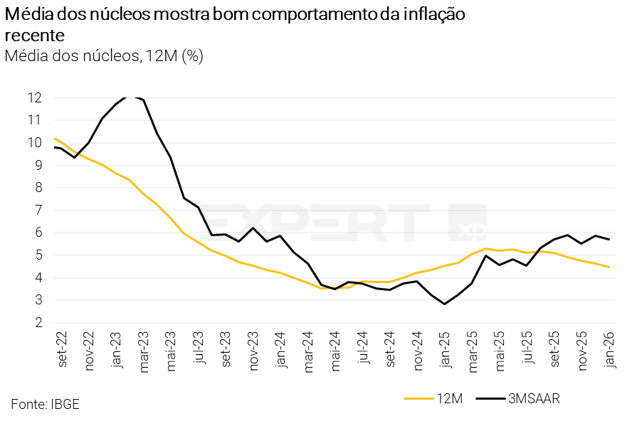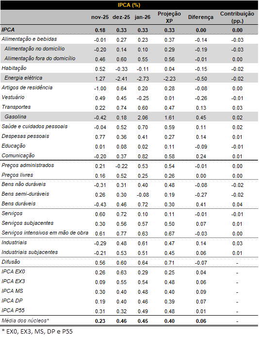 Do lado oposto, as altas acima do previsto se concentraram em gasolina (elevação de ICMS) e em bens industrializados, com destaque para automóveis novos e perfumes. Em linhas gerais, a abertura de janeiro segue sugerindo curto prazo comportado e reforça a avaliação de que o Copom pode iniciar o ciclo de cortes em março com 0,50 p.p..