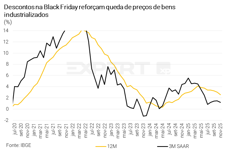 A média anualizada em três meses caiu de 1,5% para 1,2%, reforçando a tendência adicional de desaceleração. No acumulado em 12 meses, bens industrializados passaram de 3,28% em setembro para 2,56% em novembro, sinalizando perda de força consistente.