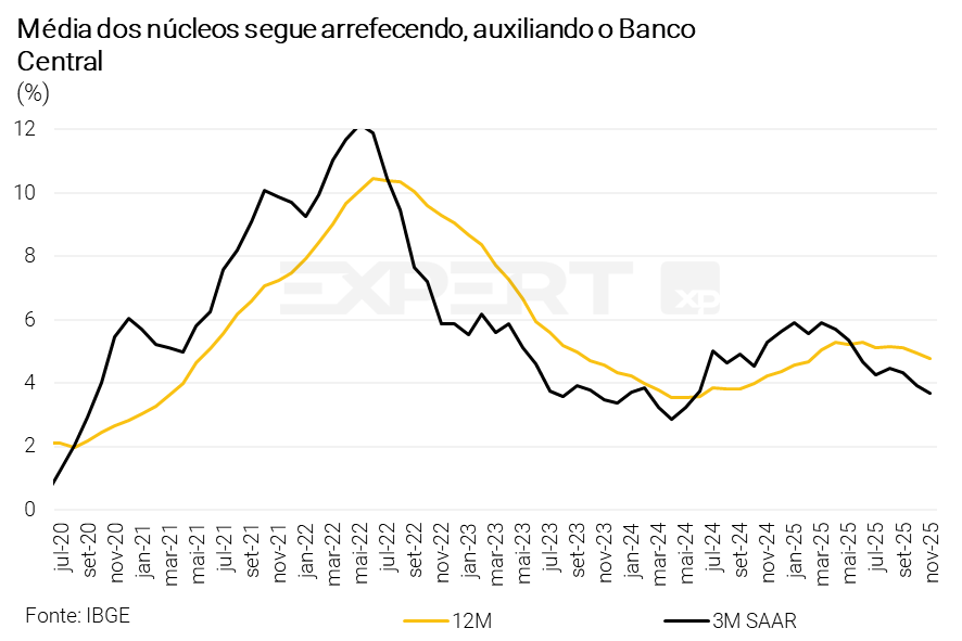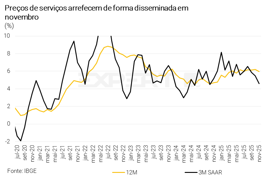 No acumulado em 12 meses, os serviços passaram de 6,14% em setembro para 5,95% em novembro, enquanto os serviços intensivos em trabalho seguem elevados, em 6,69%, apesar da desaceleração. Esse comportamento reflete um mercado de trabalho robusto, com desemprego nas mínimas históricas, sustentando salários e preços de serviços.