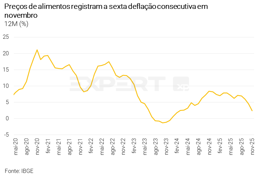 As coletas para dezembro indicam uma leitura ainda benigna, mas já em terreno inflacionário (positivo). No fim do ano, a demanda aumenta com festas e férias, o que pode elevar preços. Eventos climáticos também podem afetar hortifrutis e grãos, revertendo parte da queda observada agora.
