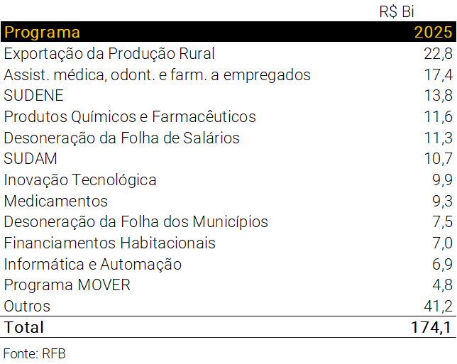 Descrição: A redução de benefícios fiscais é uma discussão complexa, que envolve cerca de 100 programas vigentes. Como apontamos anteriormente, não é possível realizar um corte linear com comando genérico — as reduções devem ser avaliadas programa a programa. Em alguns casos, é possível aumentar a alíquota (como no caso dos títulos de crédito imobiliários e do agronegócio); em outros, pode ser necessário ajustar os critérios de entrada e permanência. As diretrizes divulgadas pelo governo indicam cortes focados em empresas, com exceção dos regimes com respaldo constitucional: Simples e MEI, Zona Franca de Manaus e áreas de livre comércio, entidades filantrópicas e de assistência social, fundos constitucionais e isenções sobre itens da cesta básica.