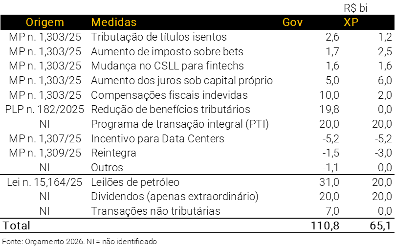 Como esperado, as receitas foram infladas por medidas extraordinárias. Além das medidas em discussão (como as da MP nº 1.303/25, que incluem a tributação de ativos hoje isentos, o aumento da alíquota sobre apostas online de imposto de renda sobre juros sobre capital próprio, entre outras), o governo incluiu uma série de receitas extraordinárias: destacam-se o leilão de áreas de partilha (além das não contratadas), dividendos extraordinários (que estimamos em R$ 20 bilhões) e a redução de gastos tributários. A tabela a seguir resume as receitas adicionais esperadas para 2026, considerando todas as medidas tomadas até o momento.
