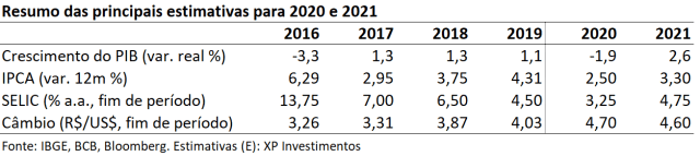 - Revisamos nossa projeção de crescimento do PIB de 2020 de +1,8% para -1,9%. Esperamos que o impacto negativo já seja sentido no primeiro trimestre e que atinja seu efeito máximo no segundo trimestre desse ano. Nossa projeção de crescimento do PIB de 2021 subiu de +2,5% para +2,6%.