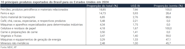 O governo dos Estados Unidos confirmou, por meio de uma Ordem Executiva, a imposição de tarifas de 50% sobre as exportações brasileiras, com vigência em sete dias. No entanto, uma lista relativamente extensa de exceções foi apresentada. Segundo nossas estimativas, essas exceções abrangem cerca de 42% do total das exportações brasileiras para os EUA (com base em valores em dólares)*. A tabela abaixo apresenta as isenções para os principais produtos exportados aos EUA.