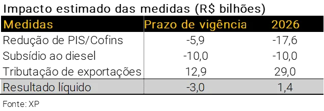 No conjunto, não consideramos que o aumento do imposto de exportação sobre petróleo bruto e diesel seja suficiente para compensar a perda de receita decorrente da redução de PIS/Cofins e do subsídio às vendas de diesel. Nossas estimativas apontam para um custo total de R$ 15,9 bilhões contra um ganho de receita de R$ 12,9 bilhões no cenário-base — a compensação integral ocorreria apenas se os preços do petróleo se aproximassem de uma média de US$ 120 por barril ou se todas essas medidas permanecessem em vigor até o final deste ano.