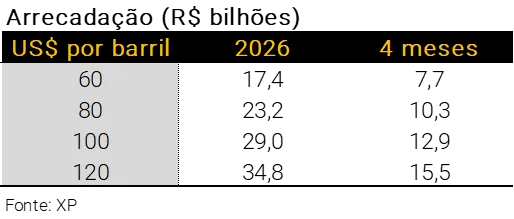 As receitas tendem a variar significativamente com o preço do barril de petróleo. Caso os preços recuem rapidamente para uma média de US$ 60, a receita estimada da medida seria de apenas R$ 17,4 bilhões no ano, ou R$ 7,7 bilhões em quatro meses. Por outro lado, uma média mais elevada — em torno de US$ 120 por barril — elevaria a arrecadação anual para R$ 34,8 bilhões, ou R$ 15,5 bilhões em quatro meses.
