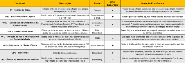 Para estimar a taxa de câmbio real de equilíbrio e o desalinhamento cambial (desvalorização persistente) na economia brasileira nos últimos anos, adotamos diferentes combinações entre variáveis econômicas e metodologias. Apresentamos abaixo a lista de indicadores utilizados em nossos testes e no processo de estimação.