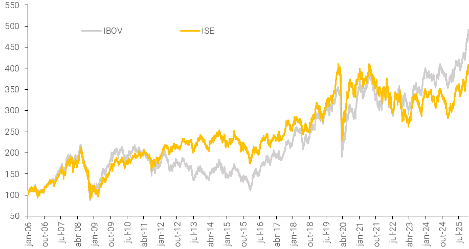 (1) O Índice ISE (Índice de Sustentabilidade Empresarial da B3) tem como objetivo ser o indicador do desempenho médio das cotações dos ativos de empresas com reconhecido comprometimento com o desenvolvimento sustentável, práticas e alinhamento estratégico com a sustentabilidade empresarial.