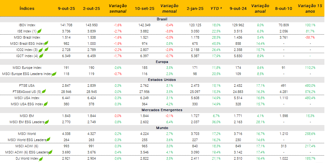 (2) O Índice S&P/B3 Brasil ESG mede a performance de títulos que cumprem critérios de sustentabilidade e é ponderado pelas pontuações ESG da S&P DJI. Ele exclui ações com base na sua participação em certas atividades comerciais, no seu desempenho em comparação com o Pacto Global da ONU e também cias sem pontuação ESG da S&P DJI.