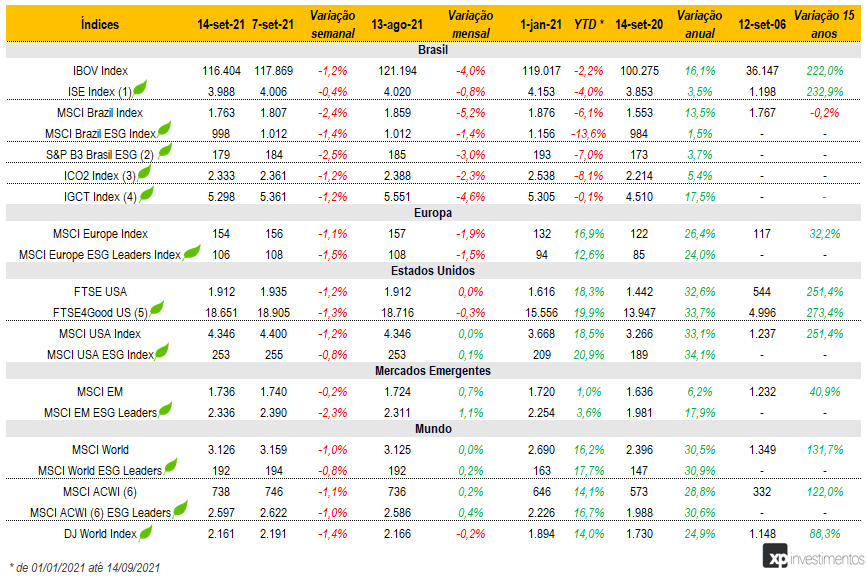 Quais tópicos abordamos ao longo do conteúdo? (i) Notícias no Brasil e no mundo acerca do tema ESG; (ii) Performance histórica dos principais índices ESG em diferentes países; (iii) Comparativo da performance do Ibovespa vs. ISE (Índice de Sustentabilidade Empresarial, da B3); e (iv) Lista com os últimos relatórios publicados pelo Research ESG da XP.