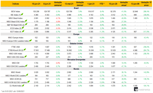 Quais tópicos abordamos ao longo do conteúdo? (i) Notícias no Brasil e no mundo acerca do tema ESG; (ii) Performance histórica dos principais índices ESG em diferentes países; (iii) Comparativo da performance do Ibovespa vs. ISE (Índice de Sustentabilidade Empresarial, da B3); e (iv) Lista com os últimos relatórios publicados pelo Research ESG da XP.
