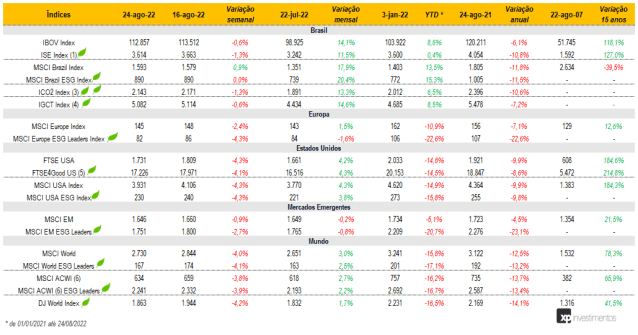 Quais tópicos abordamos ao longo do conteúdo? (i) Notícias no Brasil e no mundo acerca do tema ESG; (ii) Performance histórica dos principais índices ESG em diferentes países; (iii) Comparativo da performance do Ibovespa vs. ISE (Índice de Sustentabilidade Empresarial, da B3); e (iv) Lista com os últimos relatórios publicados pelo Research ESG da XP.