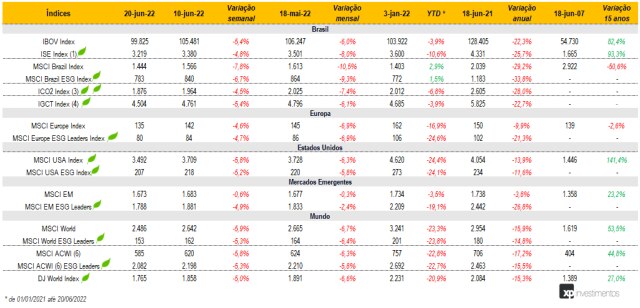 Quais tópicos abordamos ao longo do conteúdo? (i) Notícias no Brasil e no mundo acerca do tema ESG; (ii) Performance histórica dos principais índices ESG em diferentes países; (iii) Comparativo da performance do Ibovespa vs. ISE (Índice de Sustentabilidade Empresarial, da B3); e (iv) Lista com os últimos relatórios publicados pelo Research ESG da XP.
